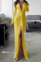 This long dress captivates with its elegant V-neckline and refined pleats at the bust. Its fluid cut hugs the curves without constraining, offering comfort and style. An ideal choice to shine at your most significant events.