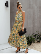 Denne lange boheme-kjole forfører med sit strålende blomsterprint og sit elegante bånd, der kan bindes om halsen. Den flydende pasform fremhæver subtilt silhuetten, samtidig med at den tilbyder en ideel komfort til varme dage. Perfekt til en sommerudflugt eller en bytur.