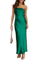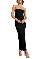 Denne lange satin kjole uden stropper fremhæver en elegant og feminin silhuet. Let og luftig, den er ideel til sommeraftener, bryllupper eller særlige lejligheder. Dens silkeagtige fald giver et strejf af raffinement, samtidig med at den sikrer optimal komfort. Fås i flere farver for at passe til alle stilarter.