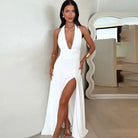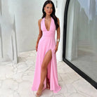 Denne lange kjole har en dyb udskæring og en høj talje, der fremhæver din silhuet. Den dristige slids og det delikate snørebånd tilføjer et strejf af sofistikering. Perfekt til elegante aftener og særlige lejligheder.