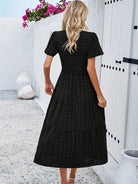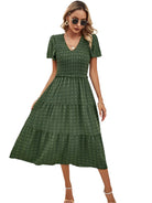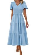 Denne boheme-chic kjole med korte ærmer er ideel til et både afslappet og elegant look. Den smockede talje fremhæver silhuetten, mens den flydende pasform sikrer optimal komfort. Perfekt til sommeren, udflugter eller solrige dage.