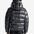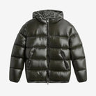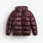 Denne korte dunjakke fremhæver en skinnende tekstur, der straks giver et moderne look. Dens voluminøse snit og brede reliefpaneler giver et struktureret udseende, ideelt til kolde dage. Den integrerede hætte og den fuldlængde lynlås gør den til en praktisk beklædningsgenstand til daglig brug.