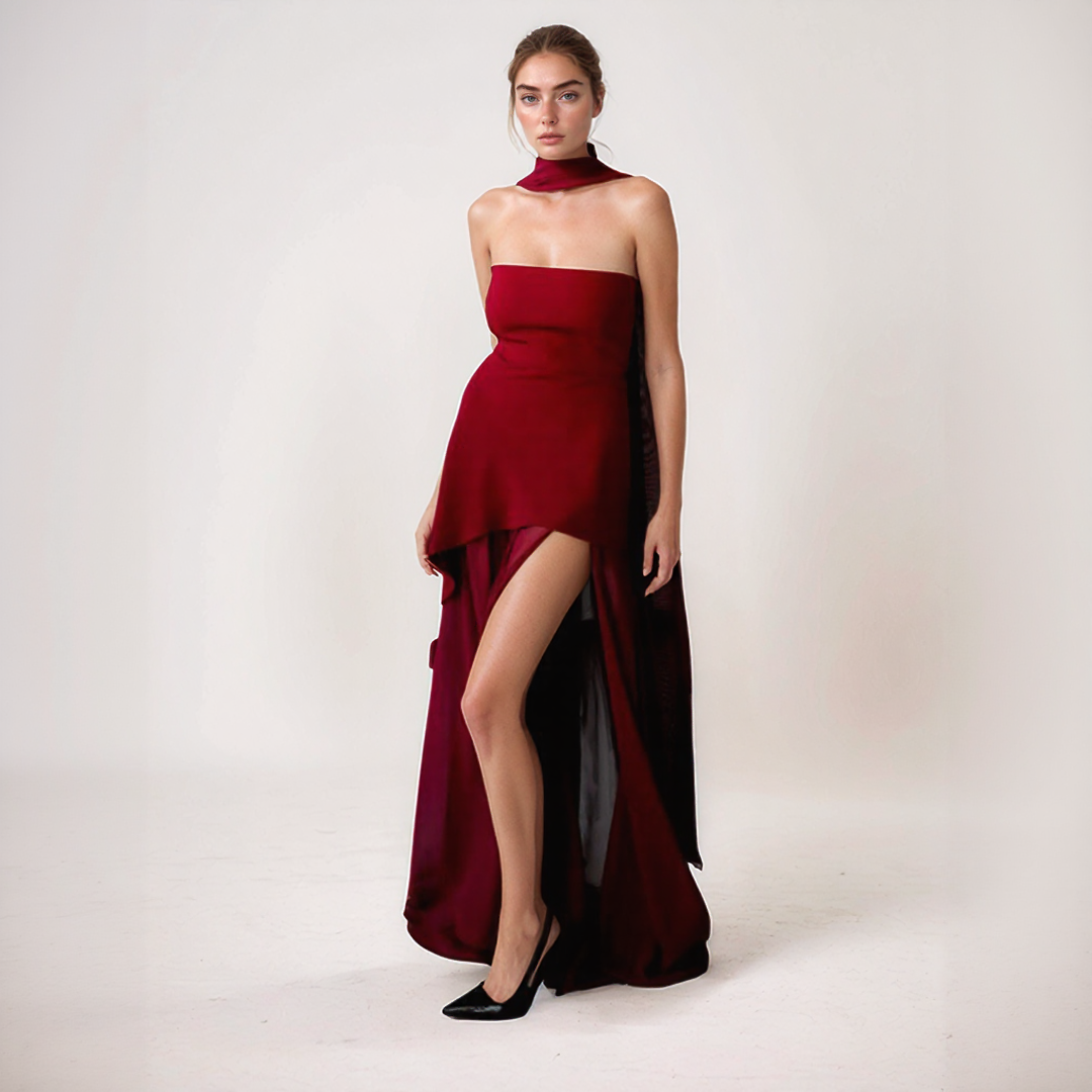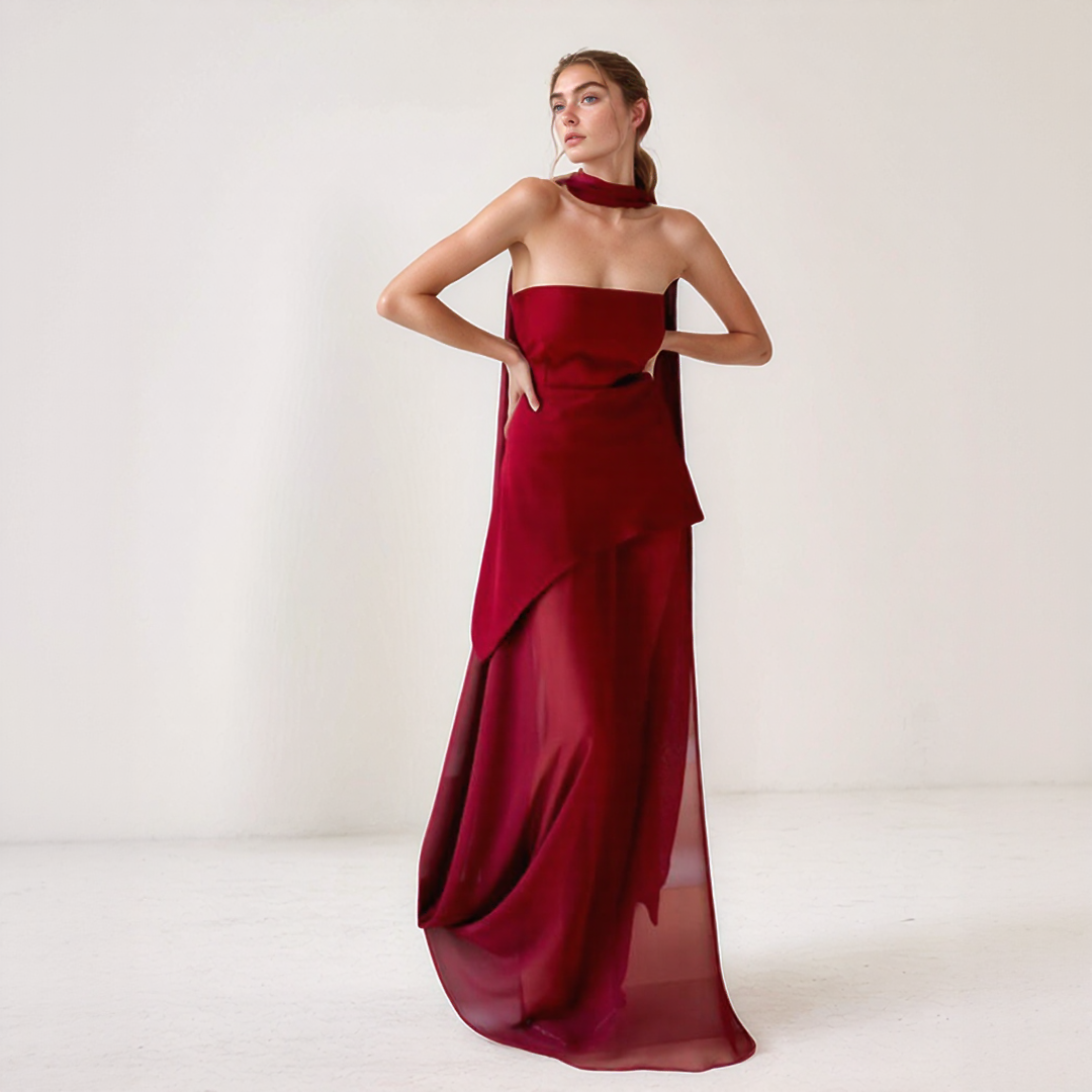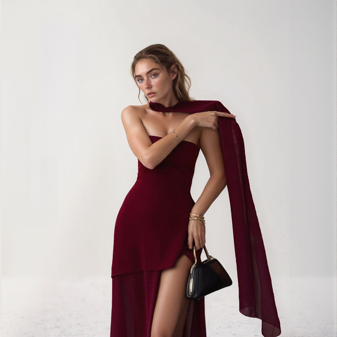 Nelly | Elegantes Langkleid – Asymmetrischer Schnitt und integrierter Schal