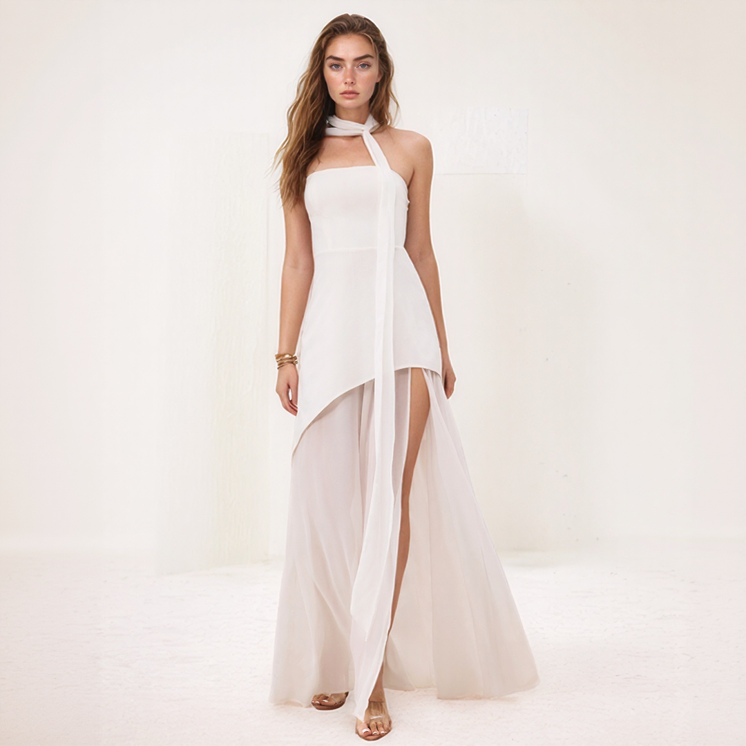 Dieses elegante lange Kleid präsentiert einen asymmetrischen Schnitt mit einem hohen und niedrigen Saum und einer Überlagerung, die Tiefe und Bewegung hinzufügt. Das integrierte Schal-Detail wickelt sich zart um den Hals oder drapiert sich über die Schulter für ein elegantes Finish. Hergestellt aus leichtem Stoff, bietet es eine fließende und bequeme Silhouette.
