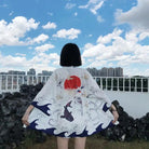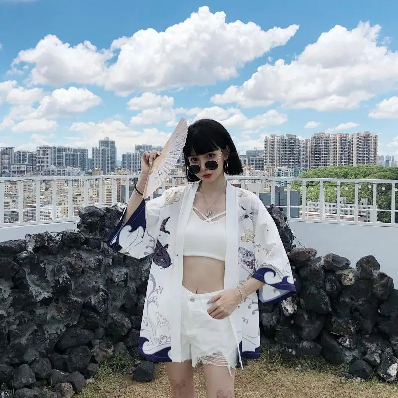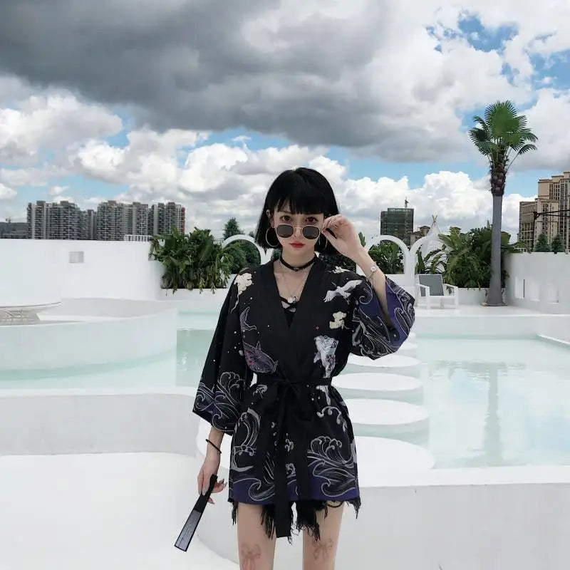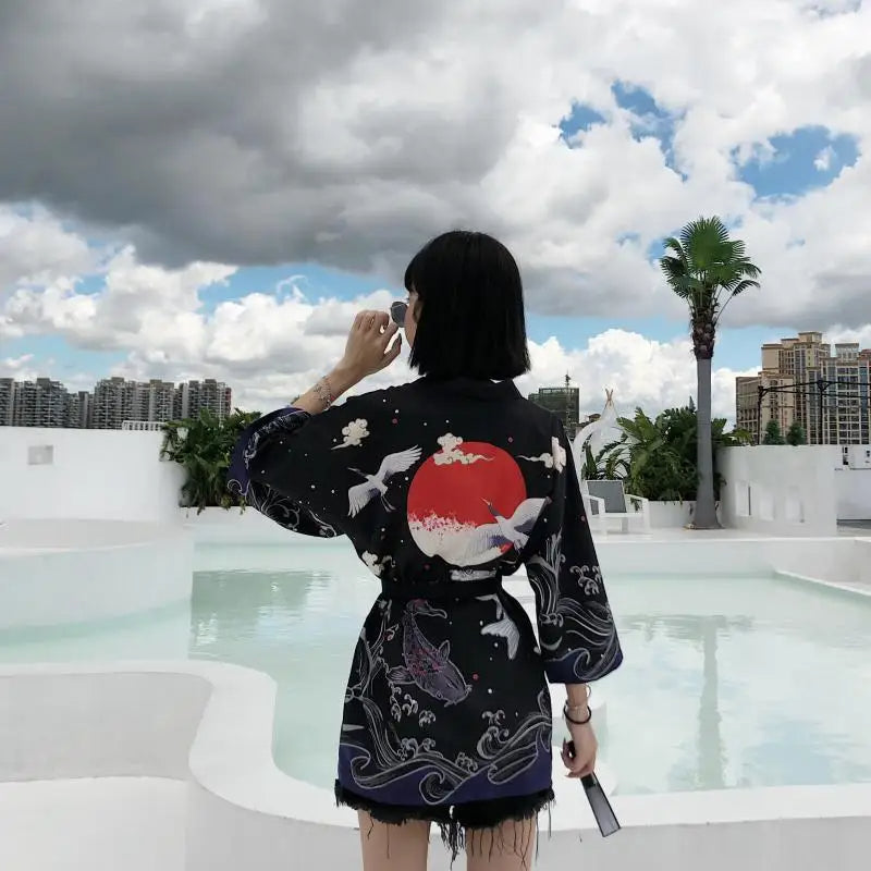 Αυτή η γυναικεία κιμονό είναι διακοσμημένη με ένα εκλεπτυσμένο μοτίβο που απεικονίζει ιαπωνικά πουλιά, σύμβολα αρμονίας και χάρης. Η άνετη και ρέουσα γραμμή της εξασφαλίζει τέλεια άνεση, είτε για μια χαλαρή εμφάνιση είτε για μια πιο επίσημη ενδυμασία.