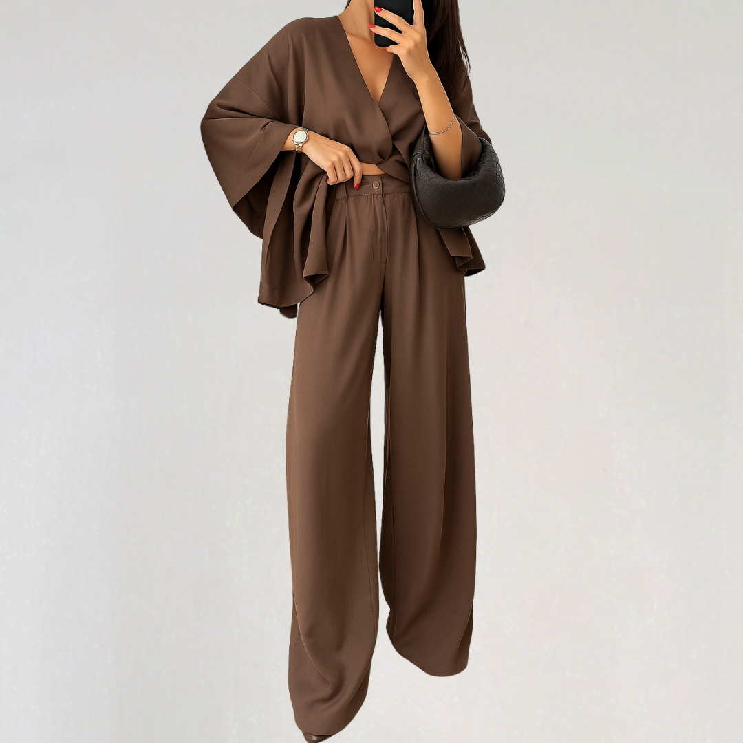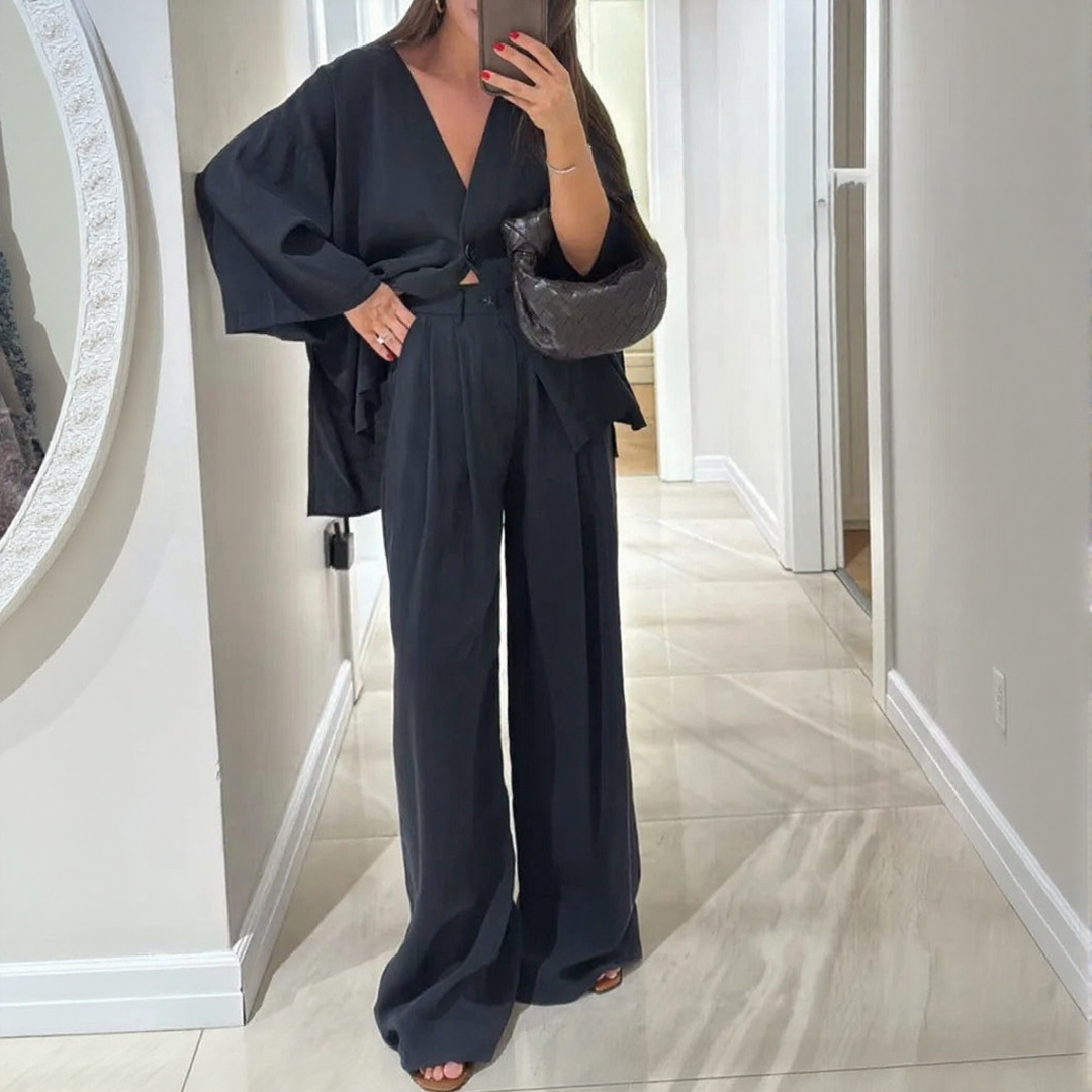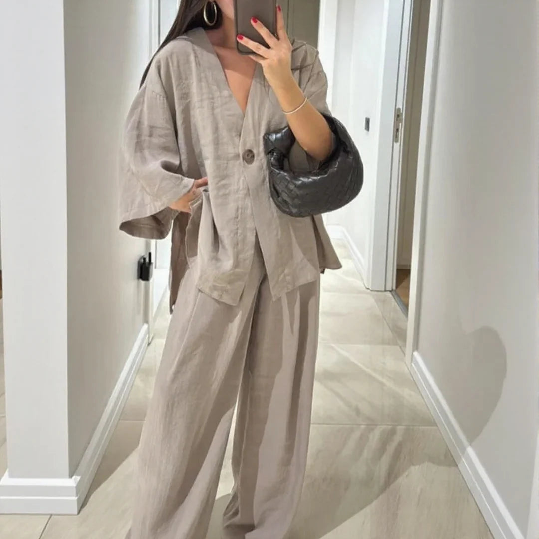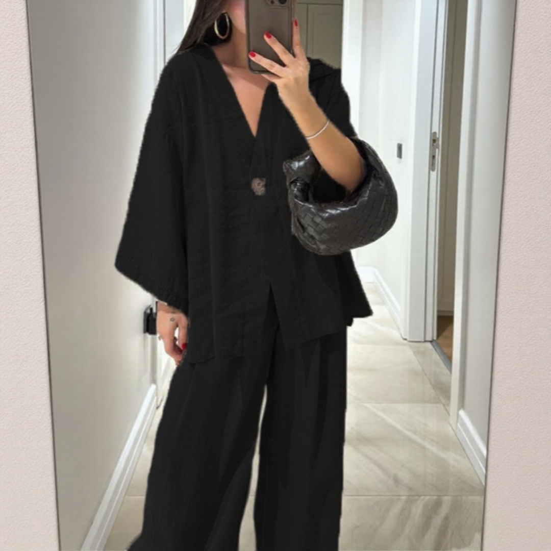 סט זה משלב טוניקה זורמת עם מכנסיים רחבים לסילואט אלגנטי. מיועד להציע חופש תנועה אופטימלי, הוא אידיאלי לימים חמים. מושלם ליציאות נינוחות או לרגעי רגיעה בבית.
