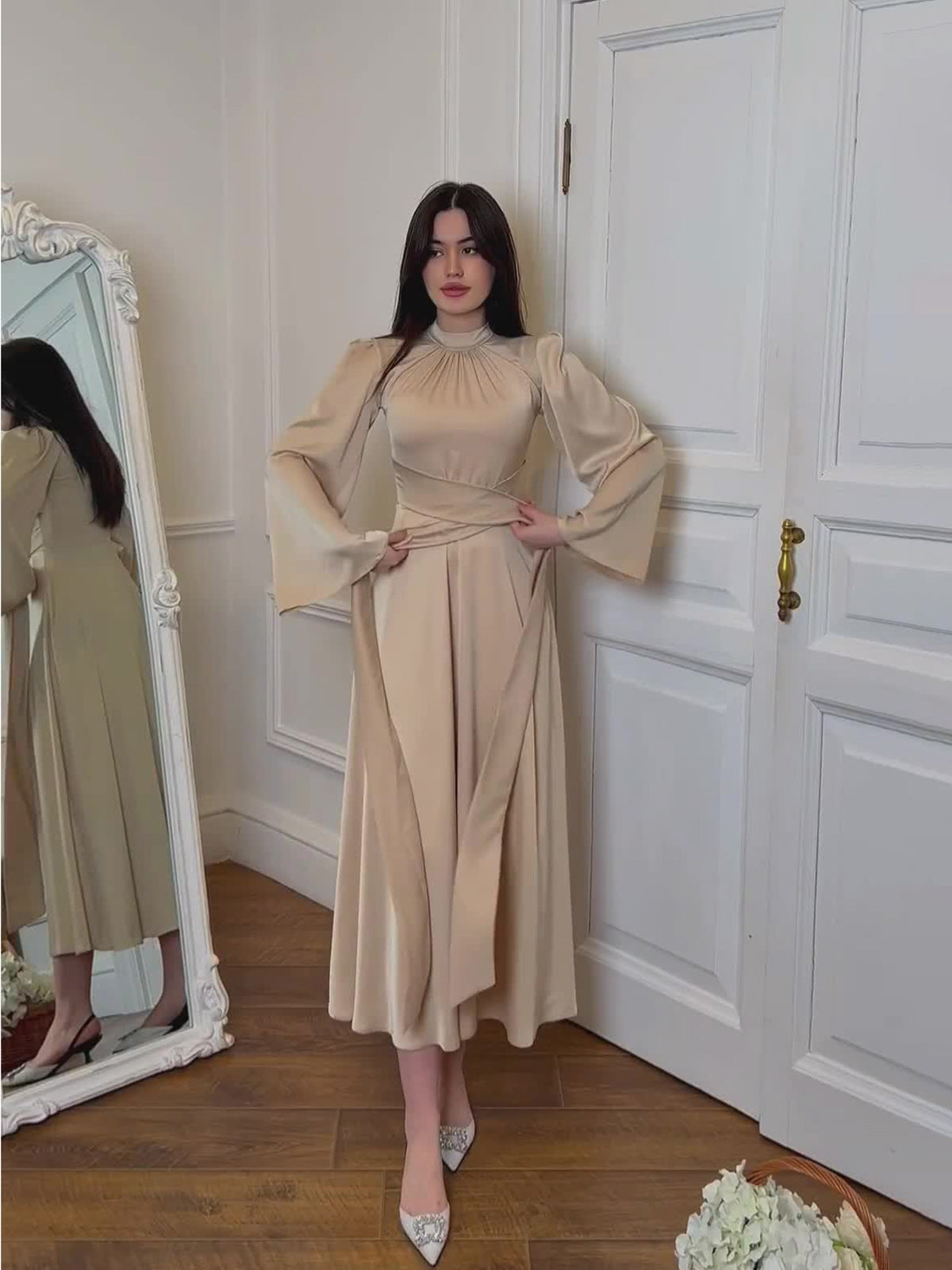 שמלות ארוכות אלו מגלמות את העידון עם צווארון גבוה, שרוולים ארוכים ודמות זורמת. החגורה המובנית מדגישה את המותן בעדינות, מוסיפה מבנה ונשיות. אידיאלית לאירועים מיוחדים, היא משלבת נוחות, סגנון ואלגנטיות בפשטות.