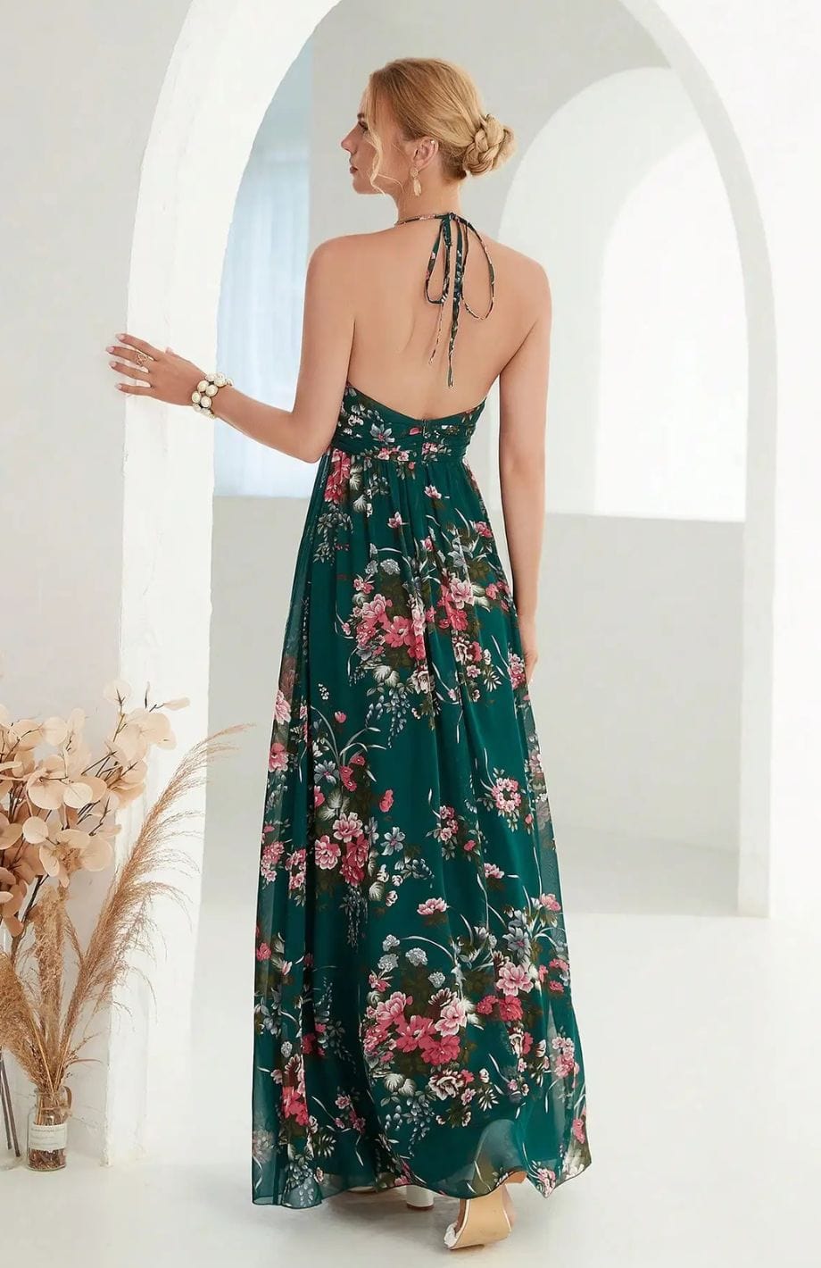 השמלה הארוכה והזורמת הזו מושלמת עבור חתונות כפריות. הצווארון שלה בצורת V והמותן המודגשת מדגישים את הסילואט. השרוולים הקצרים והמרחפים מוסיפים נופך קלילות.