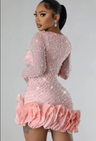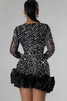 Ez a mini testhez simuló ruha csillogó kristályokkal díszített. Mély V nyaka és hosszú, testre simuló ujja elegáns sziluettet kínál. Tökéletes estékre és különleges eseményekre.