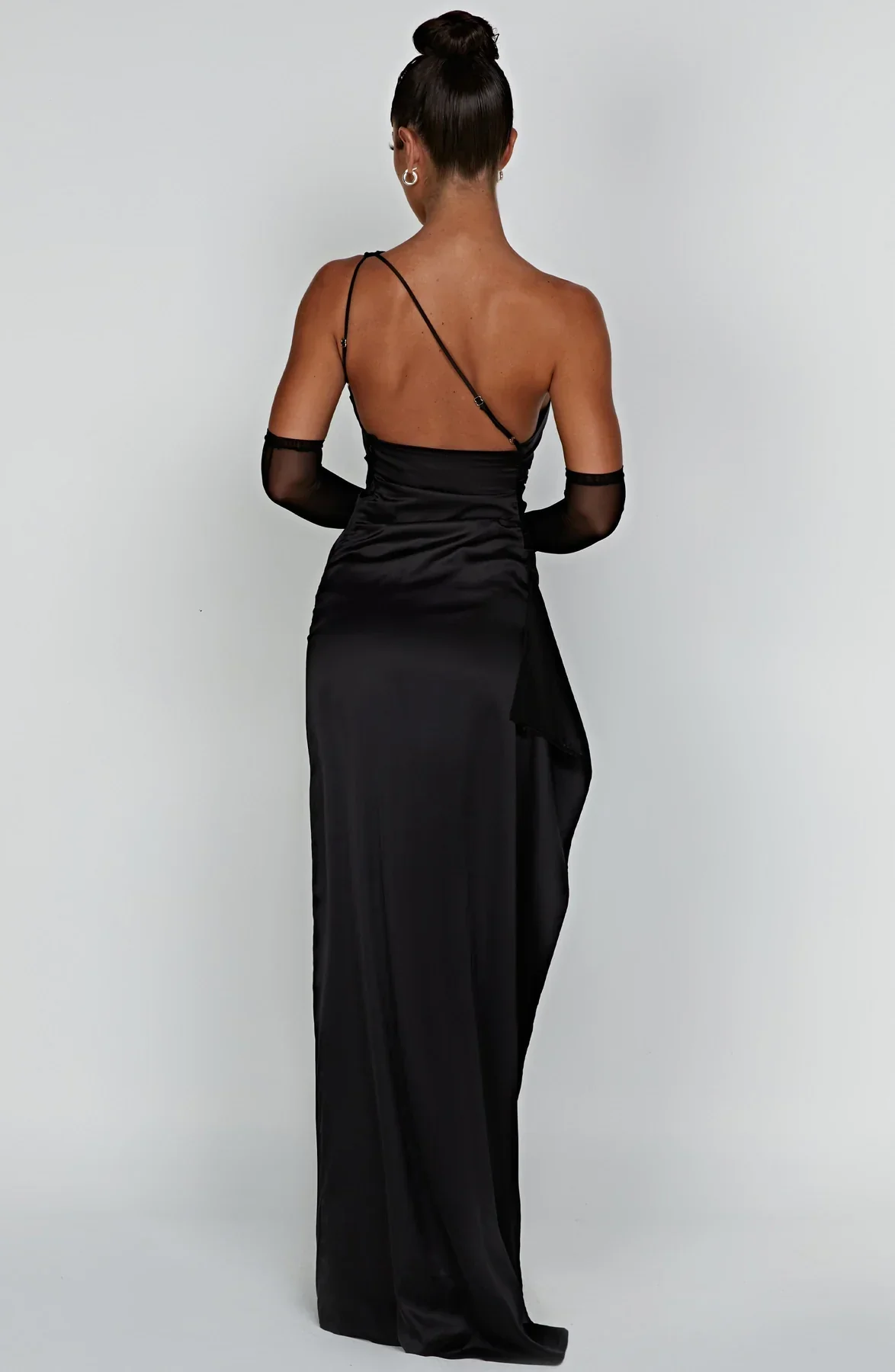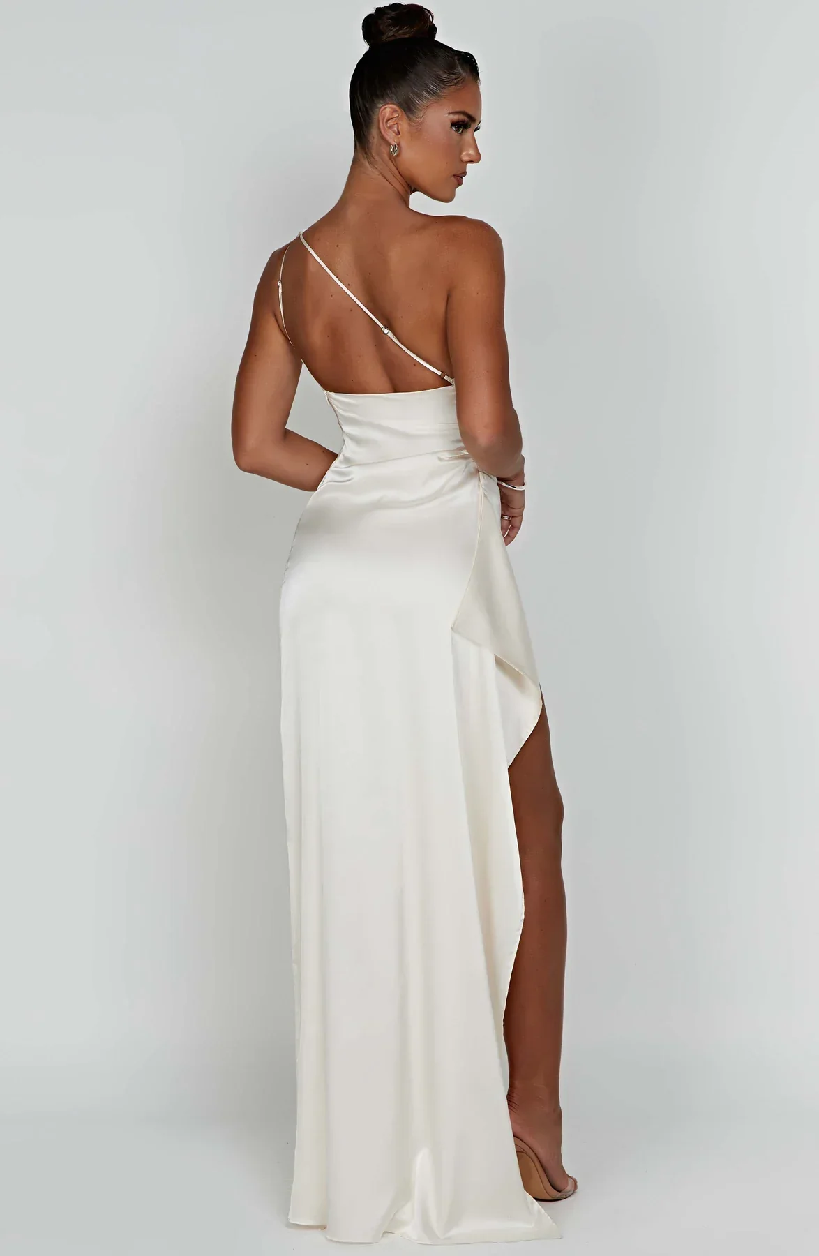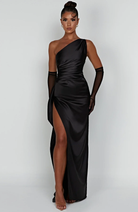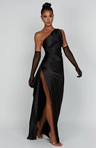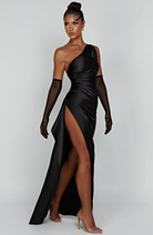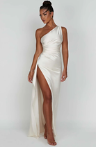 Ez a hosszú, aszimmetrikus dizájnú ruha egy oldalsó hasítékkal van kiemelve. Elegáns és kényelmes szabása ideálissá teszi estélyekre és elegáns eseményekre.