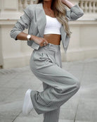 このセットは、構造的なブレザーとそれに合ったパンツを組み合わせています。エレガントでプロフェッショナルなシルエットを提供します。オフィスやフォーマルな場面に最適です。