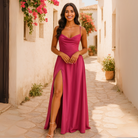 Denne langermede kjolen uten ermer legemliggjør femininitet med raffinement. Snittet fremhever skuldrene, mens den flytende splittede skjørtet følger hver bevegelse med eleganse. Myk å ta på og behagelig å ha på, den passer både til elegante kvelder og mer uformelle stunder.