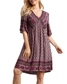 Dit boho-jurk heeft een flatterende V-hals en een elegante print. De vloeiende snit zorgt voor optimaal comfort gedurende de dag. Perfect voor casual gelegenheden of zomerse uitjes.