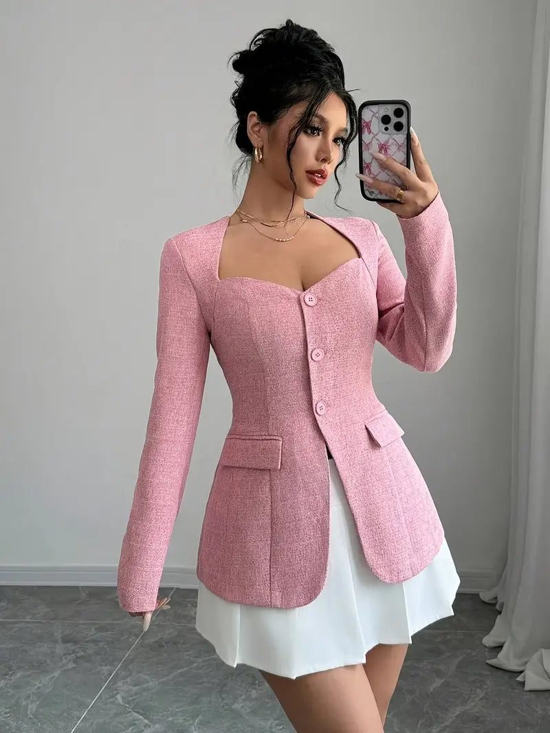 Ta zapinana kurtka podkreśla sylwetkę dzięki dopasowanemu krojowi i nowoczesnemu kwadratowemu dekoltowi. Idealna na elegancki i kobiecy wygląd, sprawdzi się zarówno w biurze, jak i na wyjściu. Jej staranny design i delikatne guziki dodają ponadczasowego szyku twojej stylizacji.