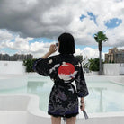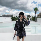 Ta damska kurtka kimono ozdobiona jest wyrafinowanym wzorem przedstawiającym japońskie ptaki, symbole harmonii i gracji. Jej luźny i zwiewny krój zapewnia doskonały komfort, zarówno w codziennym, jak i bardziej eleganckim wyglądzie.