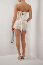 Această rochie scurtă pune în valoare silueta cu o croială tăiată îndrăzneață. Designul său fără mâneci și spatele cu șiret aduc o notă de caracter unic. Ideală pentru seri sau evenimente unde vrei să te evidențiezi cu încredere.