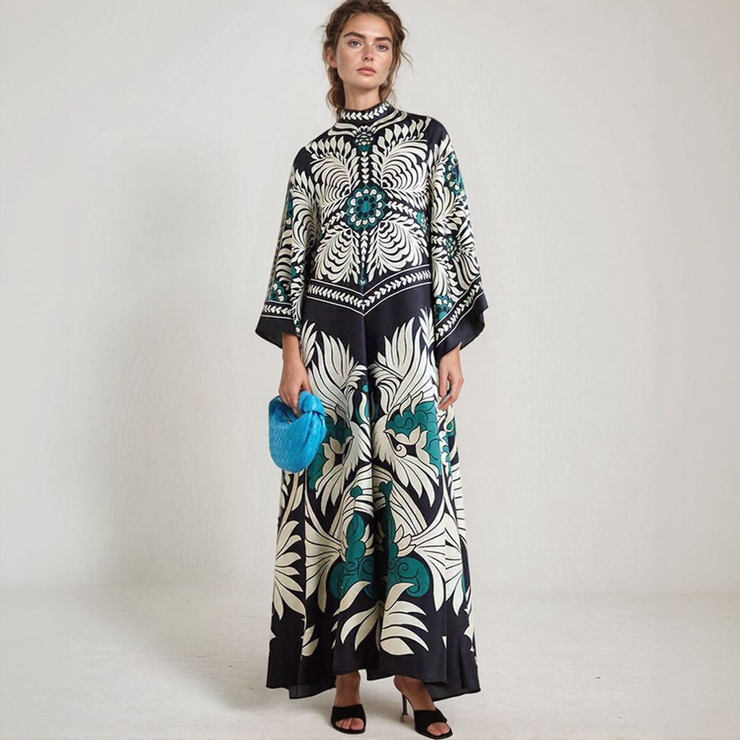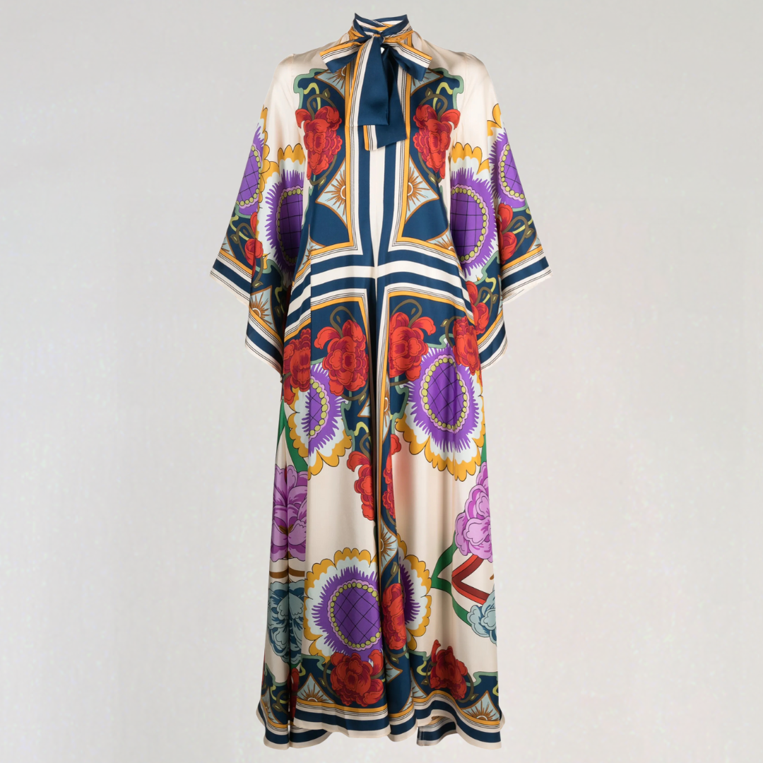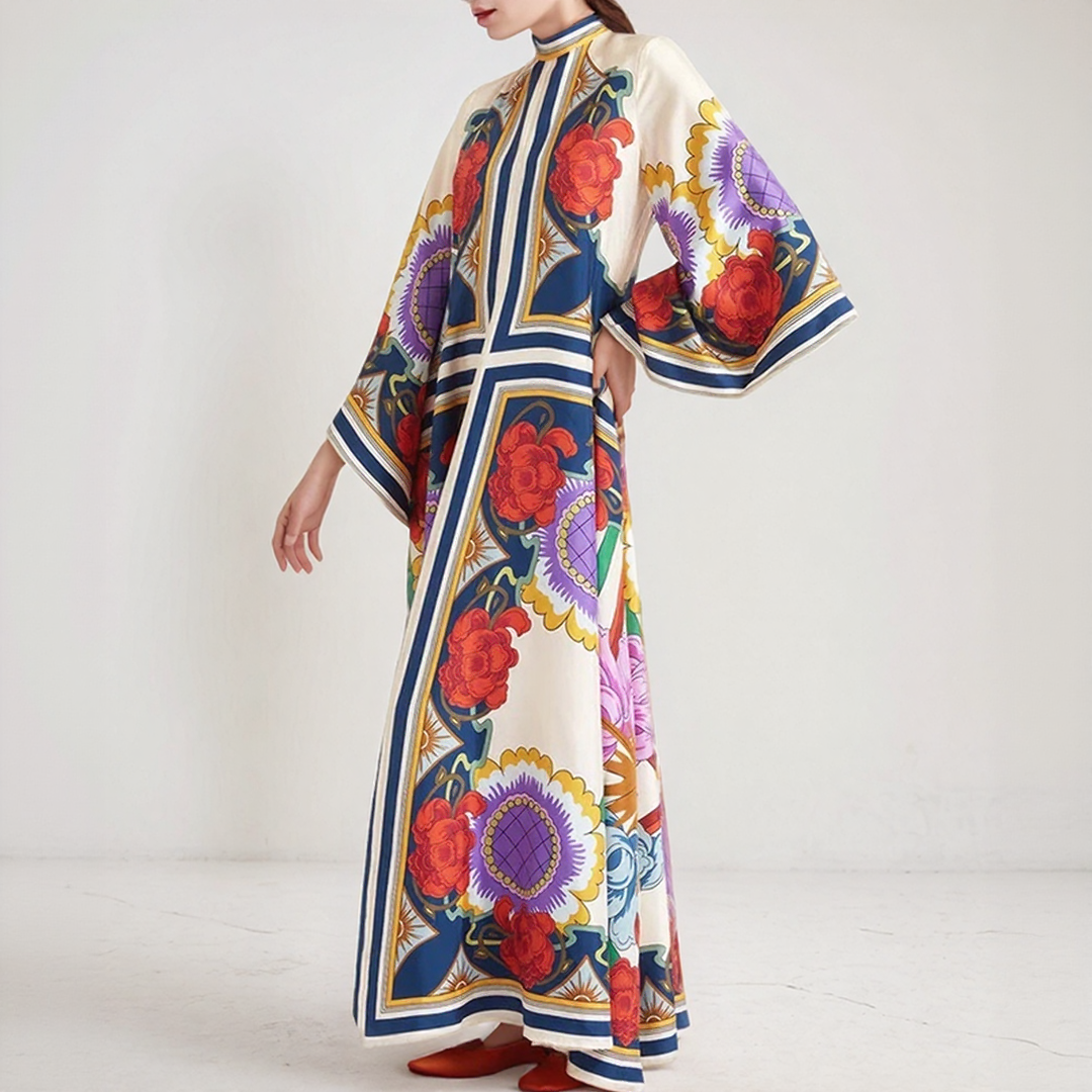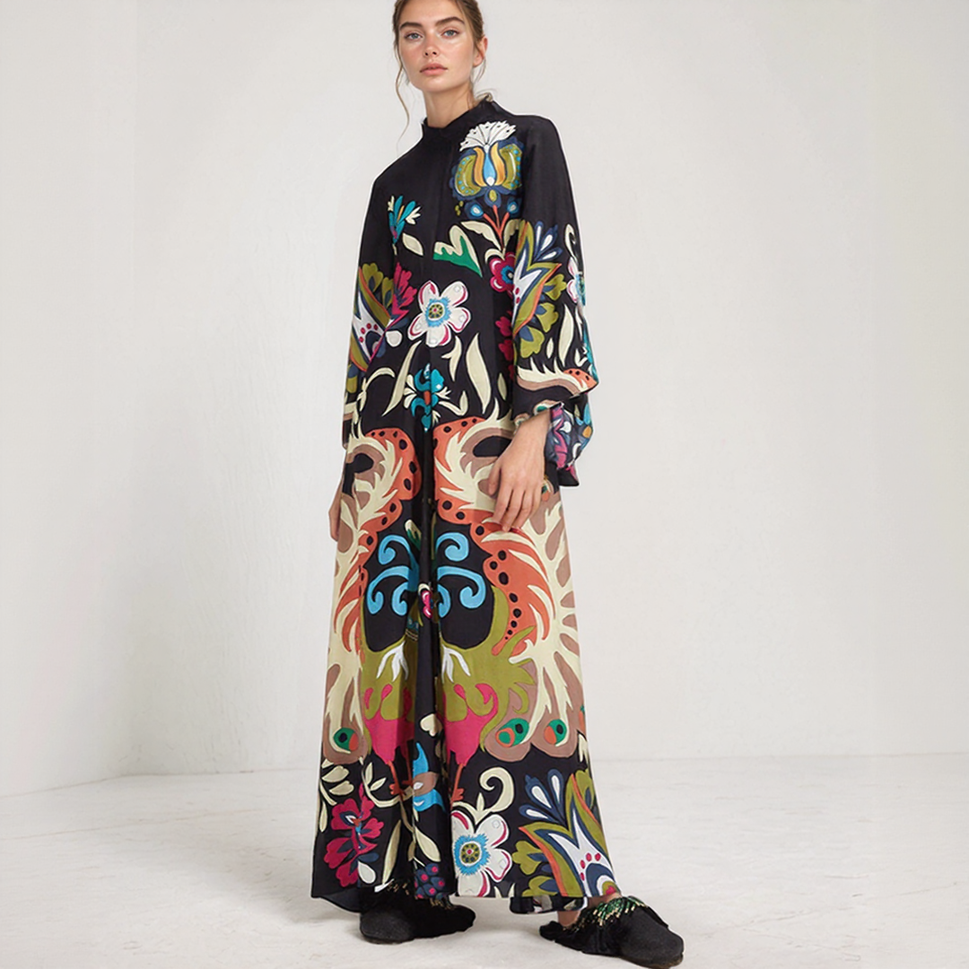 Denna långa klänning har djärva blommönster och en flytande passform. Dess högkrage med knutdetalj på baksidan ger en sofistikerad touch. Perfekt för alla säsonger, den erbjuder en tidlös bohemisk elegans.