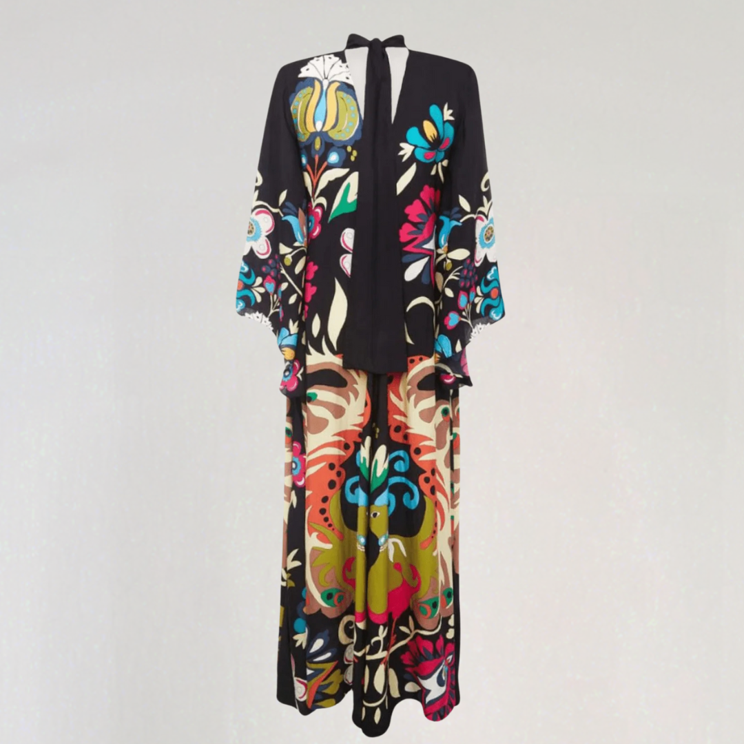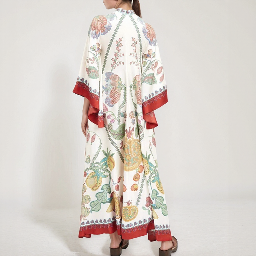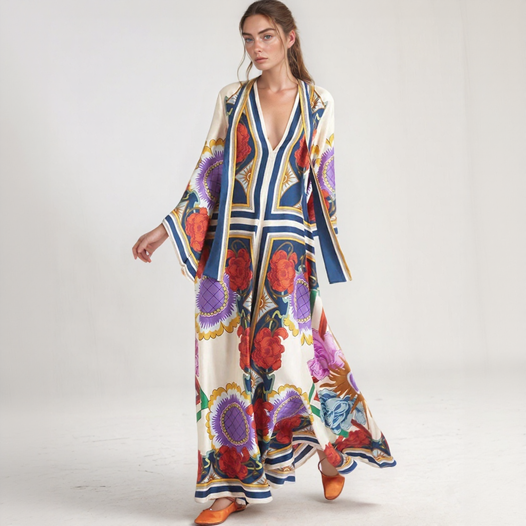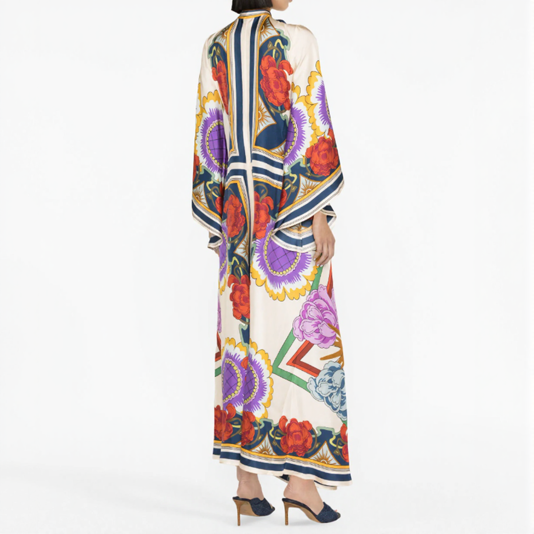 Denna långa klänning har djärva blommönster och en flytande passform. Dess högkrage med knutdetalj på baksidan ger en sofistikerad touch. Perfekt för alla säsonger, den erbjuder en tidlös bohemisk elegans.