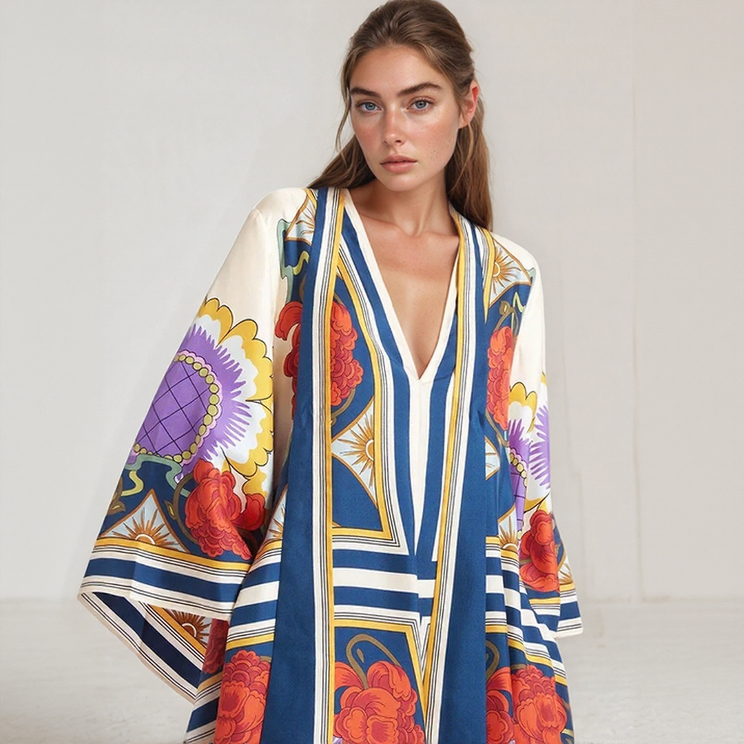 - Djärva blommönster och geometriska former för en unik konstnärlig stil.
