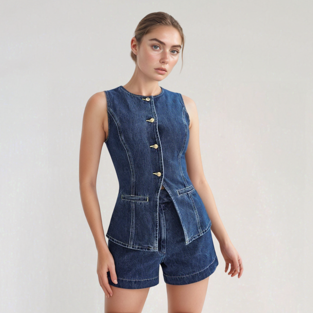 Detta set inkluderar en strukturerad ärmlös väst med gyllene knappar och framfickor. De högmidjade shortsen ger en smickrande passform och optimal komfort.
