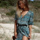 Denna långa klänning har en V-ringning och långa ärmar, vilket skapar en flytande och feminin silhuett. Dess färgglada aztekiska inspirerade mönster ger en touch av originalitet samtidigt som den förblir delikat. Perfekt för en ceremoni, förenar den komfort och raffinemang på ett perfekt sätt.